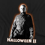 Black t-shirt with 'Halloween II' graphic featuring michael myers