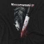 The Shape returns in terrifying style with this Halloween II t-shirt. The design captures Michael Myers’ shadowed face merged with his blood-stained knife, symbolizing the unstoppable terror that stalked Haddonfield Memorial Hospital. Printed on a black tee, it’s a bold tribute to one of horror’s most enduring sequels and a must-have for fans who know that the night wasn’t over after the original.