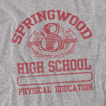 Gray t-shirt with red 'Springwood High School Physical Education' print on a white background