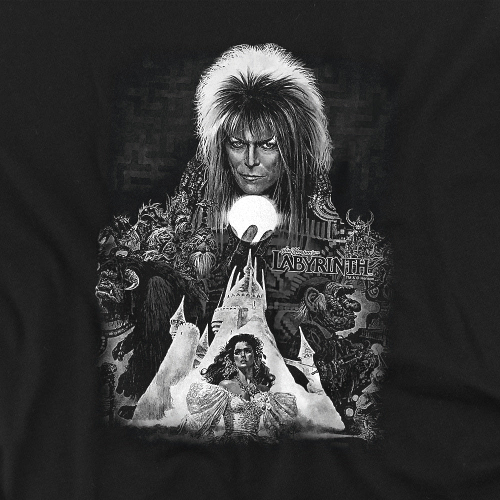 Black Labyrinth T-shirt featuring a grayscale collage of Jareth the Goblin King above Sarah and the castle, surrounded by characters and creatures from Jim Henson’s Labyrinth.