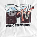 White t-shirt with Music Television logo featuring a vintage VHS tape design.