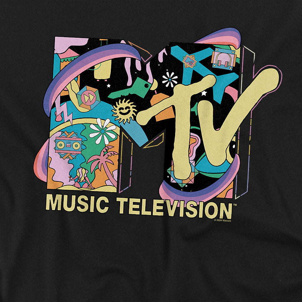 Black t-shirt with colorful 'MTV' logo and text on a white background