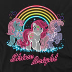 Black t-shirt with three neon-outlined My Little Pony characters under a glowing rainbow with the phrase “Shine Bright” in pink script.