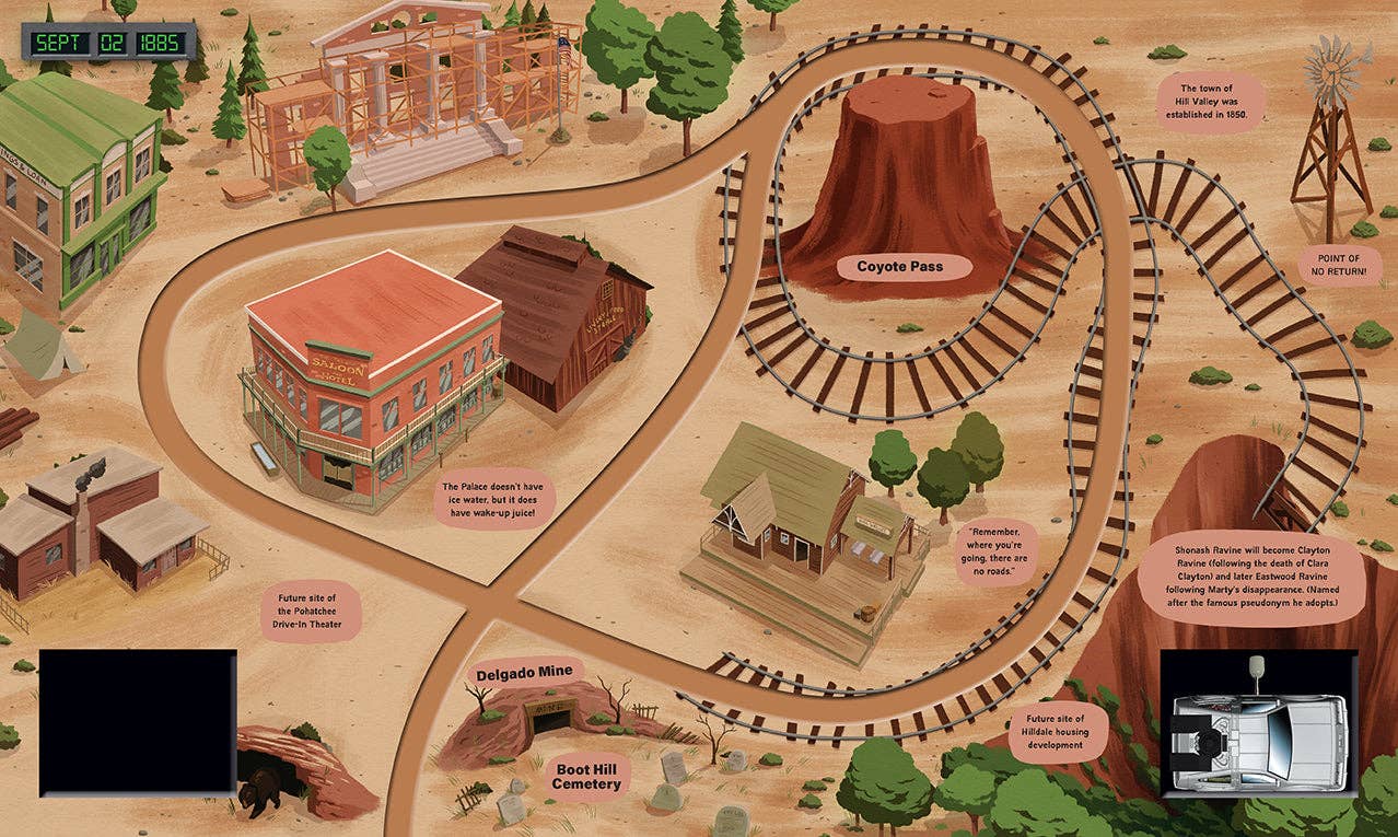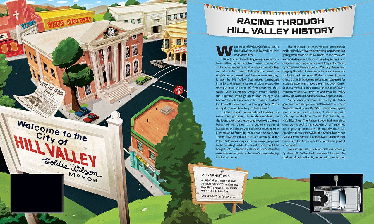 Experience beloved moments from the Back to the Future trilogy with this whimsically illustrated, interactive board book and toy DeLorean for fans of all ages. Time travelers can wind their way through the pages of history, visiting familiar spots in this quaint town during the Old West, 1955, and the far, distant future of 2015. Just wind up the DeLorean and--Great Scott!--watch it go! From the future home of Lyon Estates to the broken clock tower in the center of town, follow along as the DeLorean visits all the hot spots from the hit movie series. Bursting with fun facts and trivia about the town of Hill Valley, Back to the Future: Race Through Time is both an informative blast from the past and a fun ride into the future.