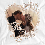 White t-shirt featuring Westley and Buttercup kissing inside ornate heart frames with the words “Tru Wuv” and The Princess Bride logo above.