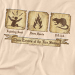 Beige t-shirt featuring distressed icons of Lightning Sand, Flame Spurts, and R.O.U.S. from The Princess Bride labeled “Three Terrors of the Fire Swamp.”