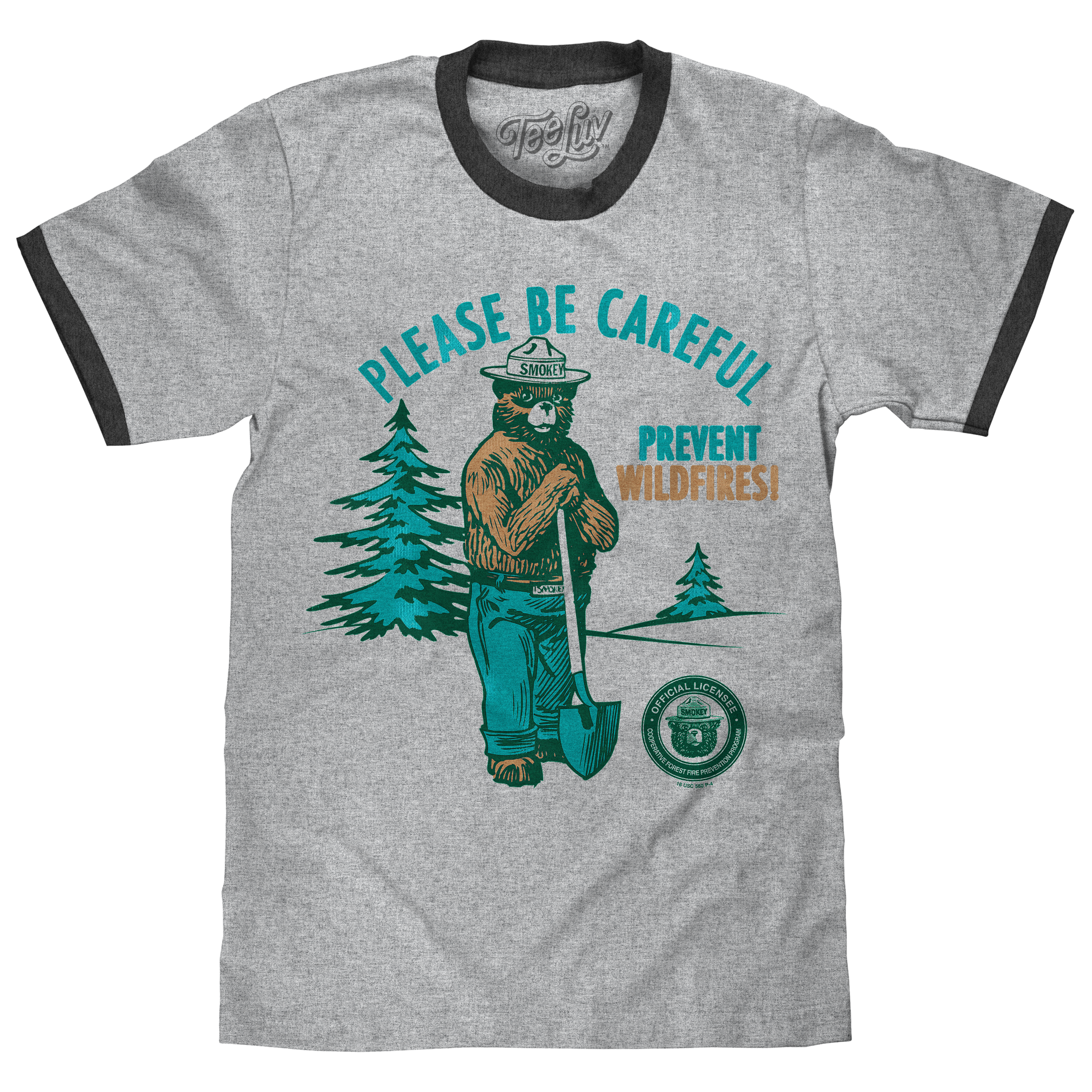 Smokey Bear Please Be Careful Prevent Wildfires Ringer T-Shirt - Gray and Black