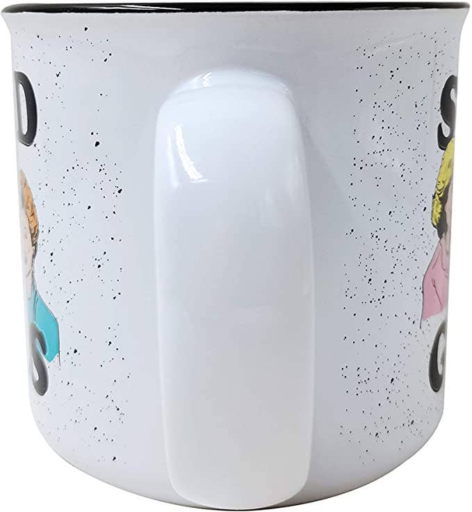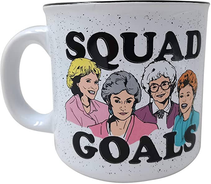 Large camper-style mug: get together with everyones favorite squad the Golden Girls, pictured alongside text that reads "squad goals" Multiple uses: not just for coffee, our novelty coffee mug can also be used as a paper-weight, storage for pens, loose change, candy, or even mug cakes Durable and sturdy: our camper coffee mug is perfect for hot or cold beverages, is BPA-free, microwave safe and top-shelf dishwasher safe Officially licensed: have confidence knowing you are purchasing an Officially licensed Golden Girls product from Rerun the 80s! Makes a great gift for all the golden girls fans in your life or your best squad-mates!