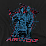 Black t-shirt featuring the cast of Airwolf in blue and red line art with the Airwolf helicopter and logo.