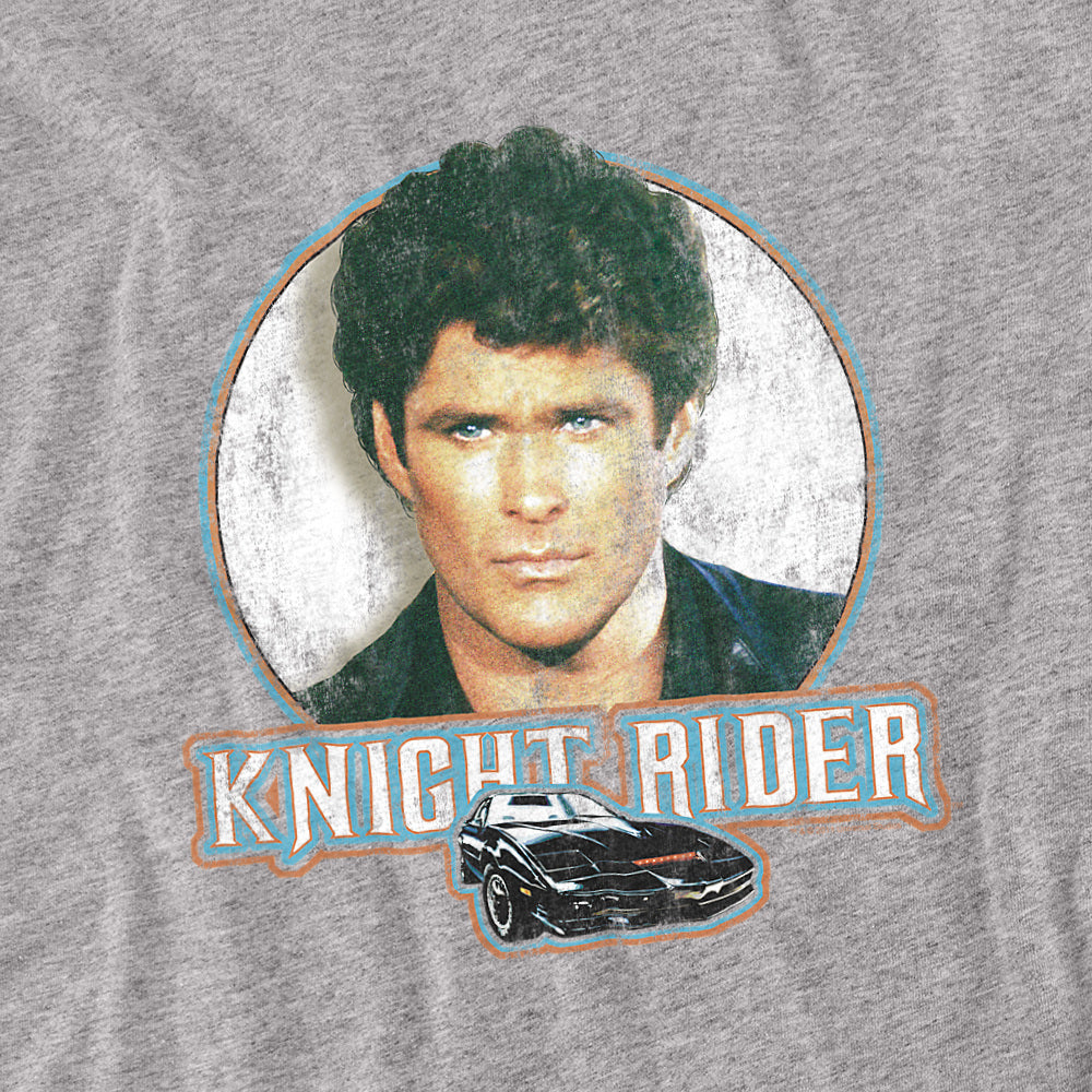 Heather gray t-shirt featuring Michael Knight (David Hasselhoff) portrait above KITT, with the Knight Rider logo.
