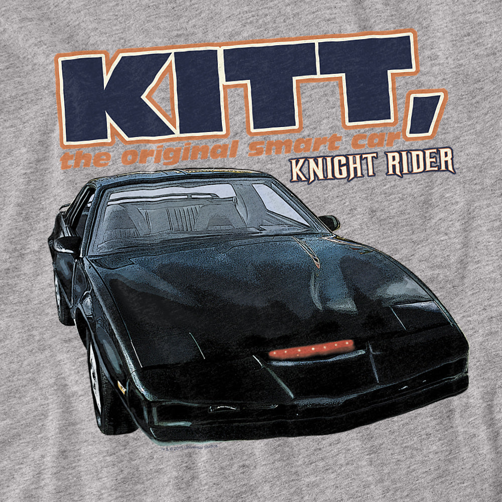 Gray Knight Rider t-shirt featuring KITT, the sleek black Trans Am car with glowing red scanner light, with large bold text reading “KITT, the original smart car” above and “Knight Rider” below.