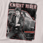T-shirt featuring a black-and-white image of David Hasselhoff as Michael Knight from the TV series Knight Rider, leaning against KITT with arms crossed, distressed style with bold red “Knight Rider” text above.
