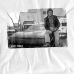 White t-shirt featuring a black-and-white photo of Michael Knight (David Hasselhoff) leaning against KITT, the iconic Pontiac Trans Am from Knight Rider. The Knight Rider logo appears in the bottom corner.