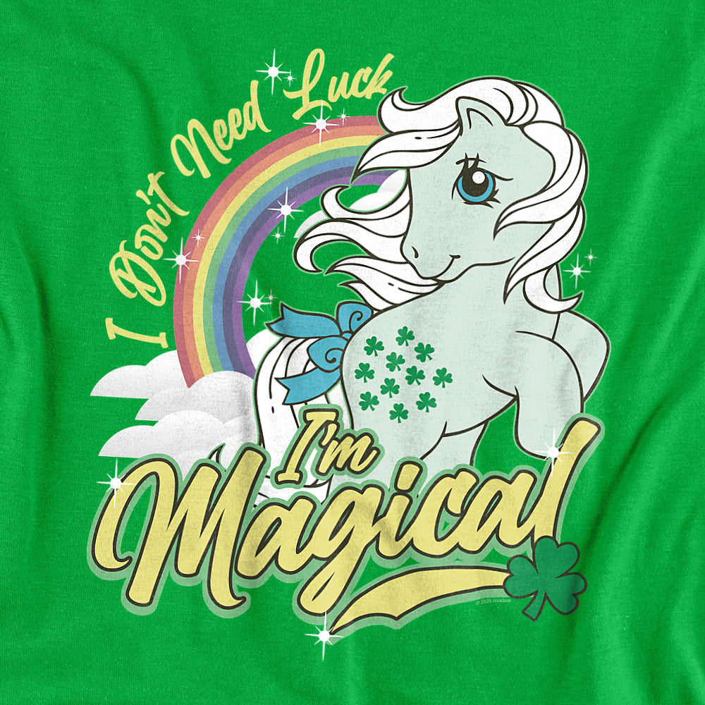 Green My Little Pony T-shirt featuring magical unicorn with rainbow and shamrocks reading “I Don’t Need Luck I’m Magical”
