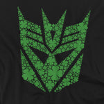 Black Transformers T-shirt featuring a green Decepticon emblem made of shamrock shapes