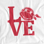 White Teenage Mutant Ninja Turtles t-shirt featuring a red “LOVE” design with Michelangelo’s face peeking through the letters.