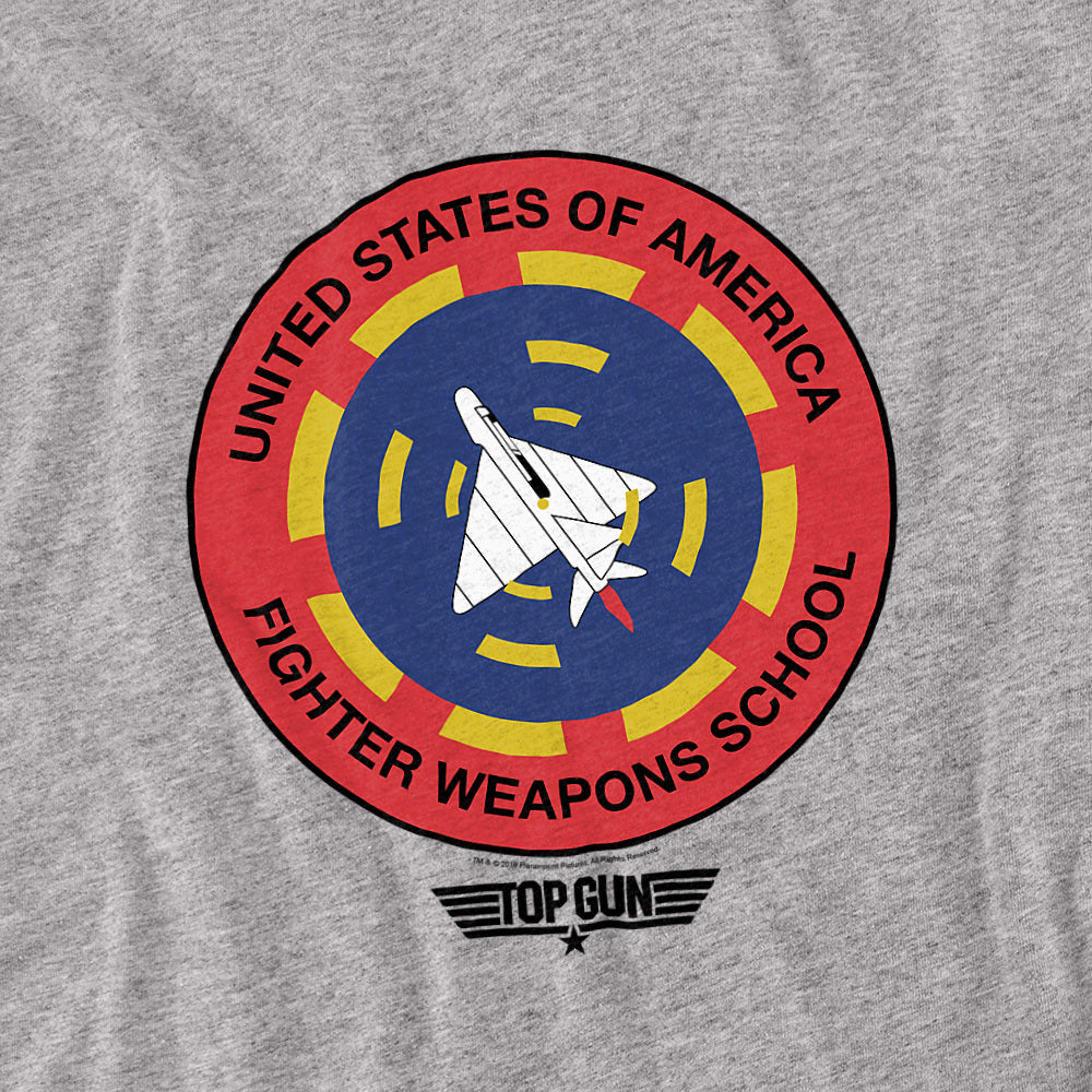 Heather grey T-shirt with circular Top Gun Fighter Weapons School patch logo and jet graphic.