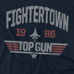 Navy blue T-shirt with distressed “Fightertown 1986” and Top Gun logo graphic.