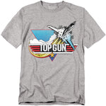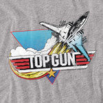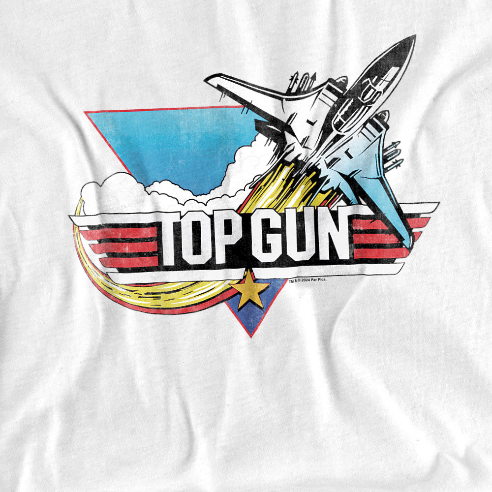White t-shirt featuring a retro fighter jet graphic blasting through clouds with the Top Gun logo in bold red and black stripes.