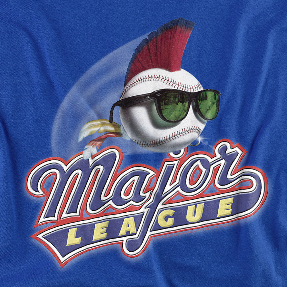 Royal blue t-shirt with the Major League movie logo featuring a baseball wearing sunglasses and a red mohawk, flying forward with motion lines.