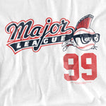White t-shirt with Major League movie logo, mohawk baseball mascot in sunglasses, and large red “99” design.
