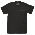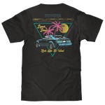 When the sun dips low and the road opens up, there's really only one way to drive - full throttle with 80s attitude! We've crafted this retro Toyota t-shirt inspired by the iconic Supra MK2 and the unforgettable synthwave style of Miami nights long past. On the front, we've kept it clean with a subtle Toyota logo on the left chest. Flip to the back and the real show begins with a detailed silhouette of an 80s Supra set against a neon sunset, palm trees and the bold "Super Sonic" and "Ride Like The Wind" text. To give this Toyota Supra shirt some extra vintage vibes - we've distressed the graphic and printed it on a soft, black cotton tee. Perfect for showing your Supra love any day of the week!