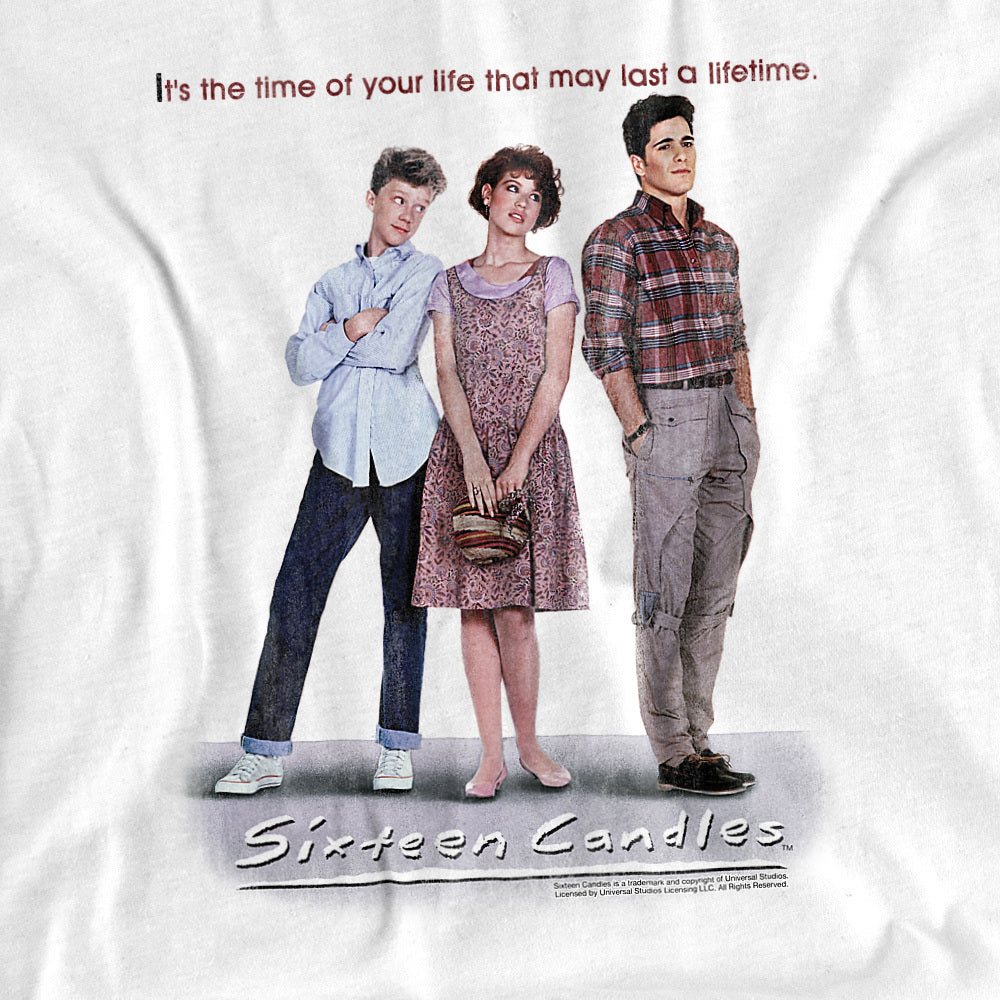 White t-shirt featuring characters from Sixteen Candles: Ted, Samantha, and Jake standing together with the movie’s tagline above and title below.