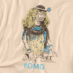 Beige t-shirt with a graphic of E.T. from the movie 'E.T.' and '#OMG' text.