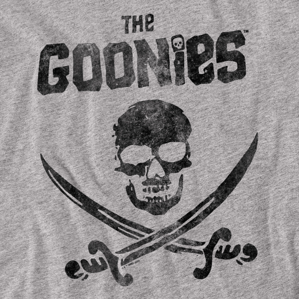 Gray t-shirt with 'The Goonies' logo featuring a skull and crossed swords on a white background.