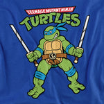 Blue t-shirt featuring Leonardo from Teenage Mutant Ninja Turtles holding twin katanas with retro cartoon artwork.