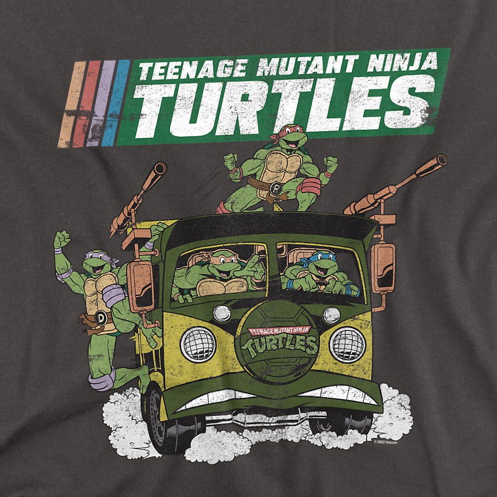 Charcoal t-shirt featuring the Teenage Mutant Ninja Turtles riding in the Party Wagon van with retro cartoon artwork.