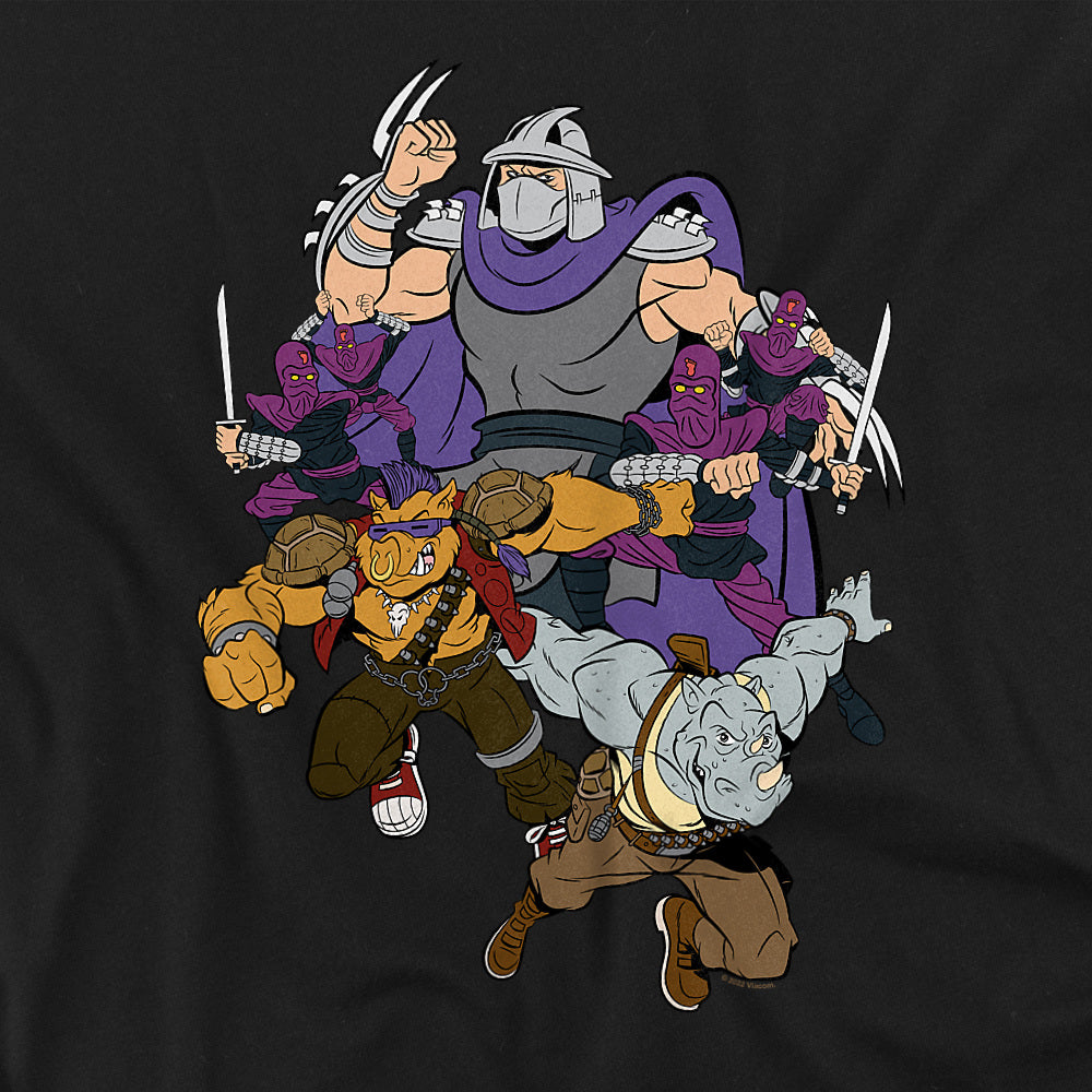 Black t-shirt featuring TMNT villains Shredder, Bebop, Rocksteady, and Foot Clan ninjas in retro cartoon artwork