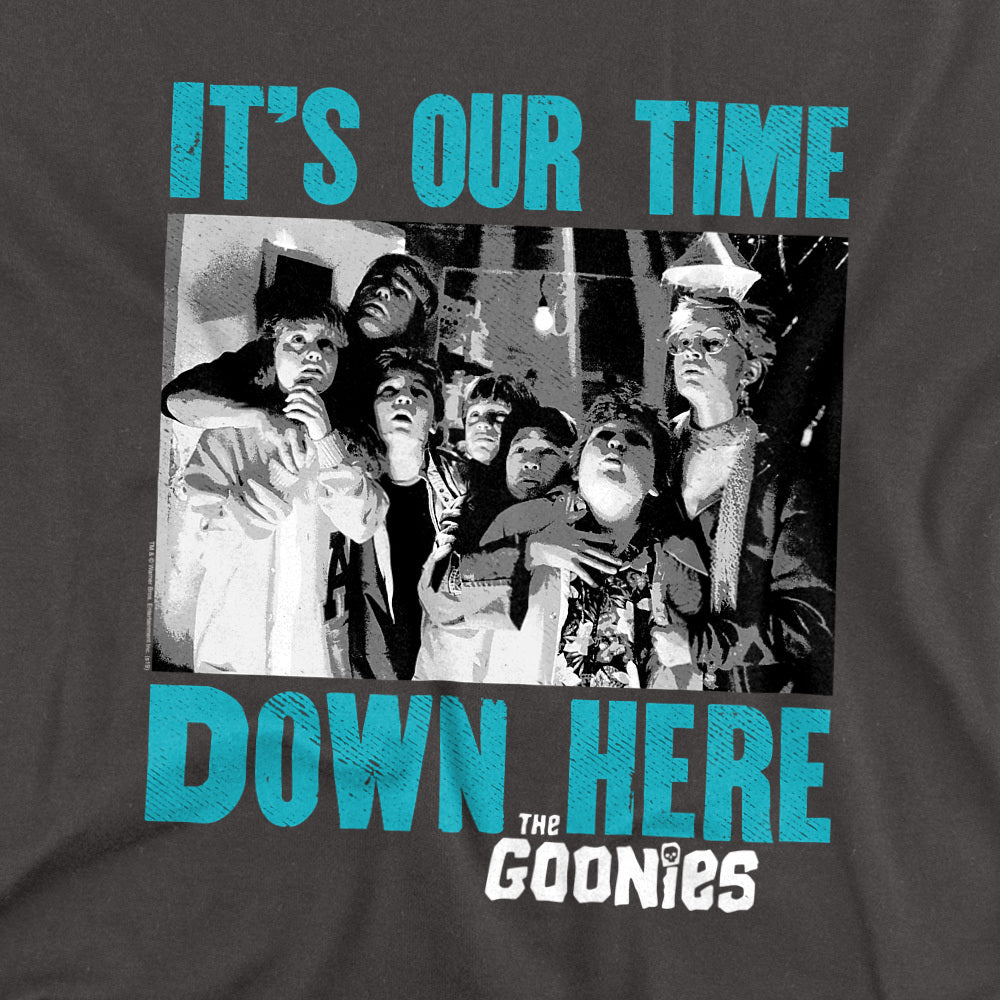 T-shirt with 'It's Our Time Down Here' text and Goonies graphic on a white background