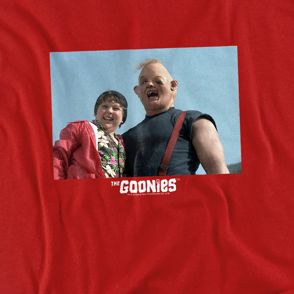 Red t-shirt with a graphic of two people and 'The Goonies' text on a white background