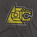 A charcoal gray t-shirt featuring the yellow lion head from Voltron in a bold, angular graphic design. The artwork highlights the mechanical details of the lion’s face, symbolizing its role as one of Voltron’s mighty limbs.