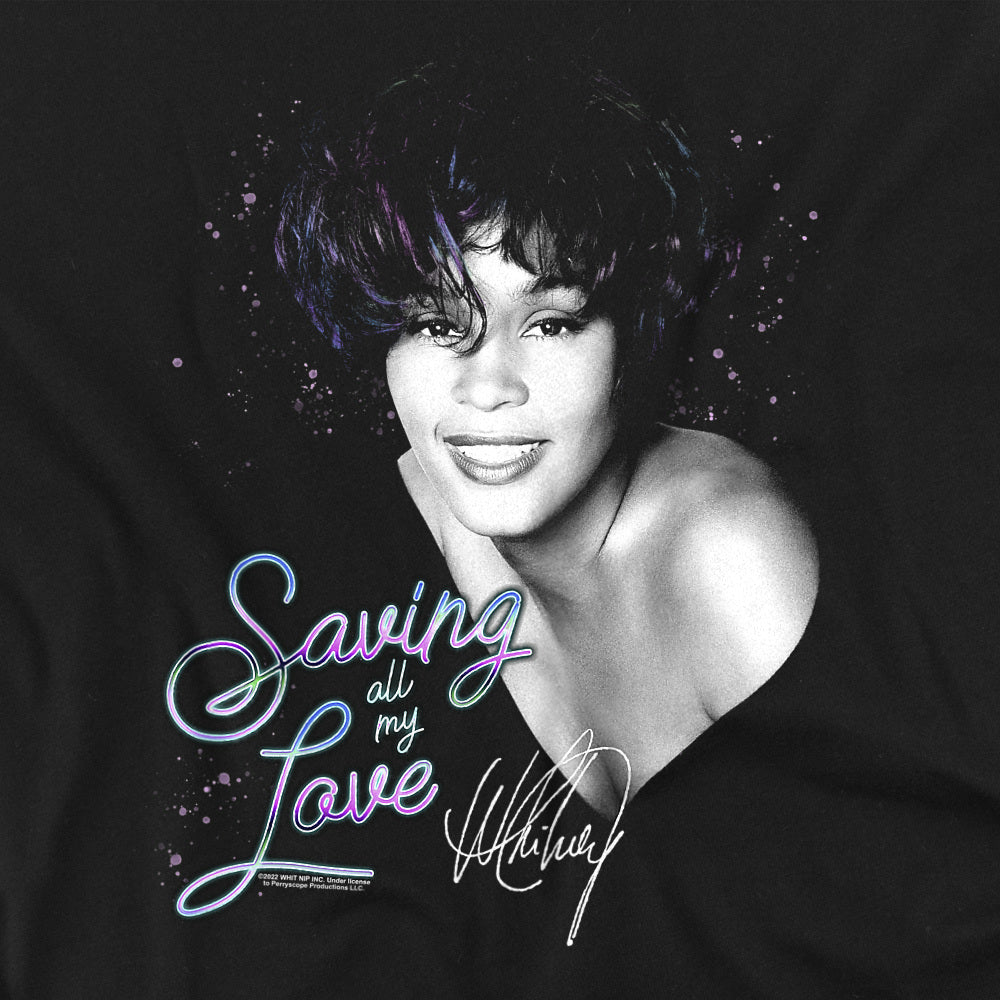 Black T-shirt featuring a black-and-white portrait of Whitney Houston with neon text reading “Saving All My Love” and her signature underneath.