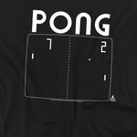 Black t-shirt featuring a retro Pong game screen graphic with the word "PONG" above a simple white outline of the court, paddles, ball, and a score of 7 to 2.