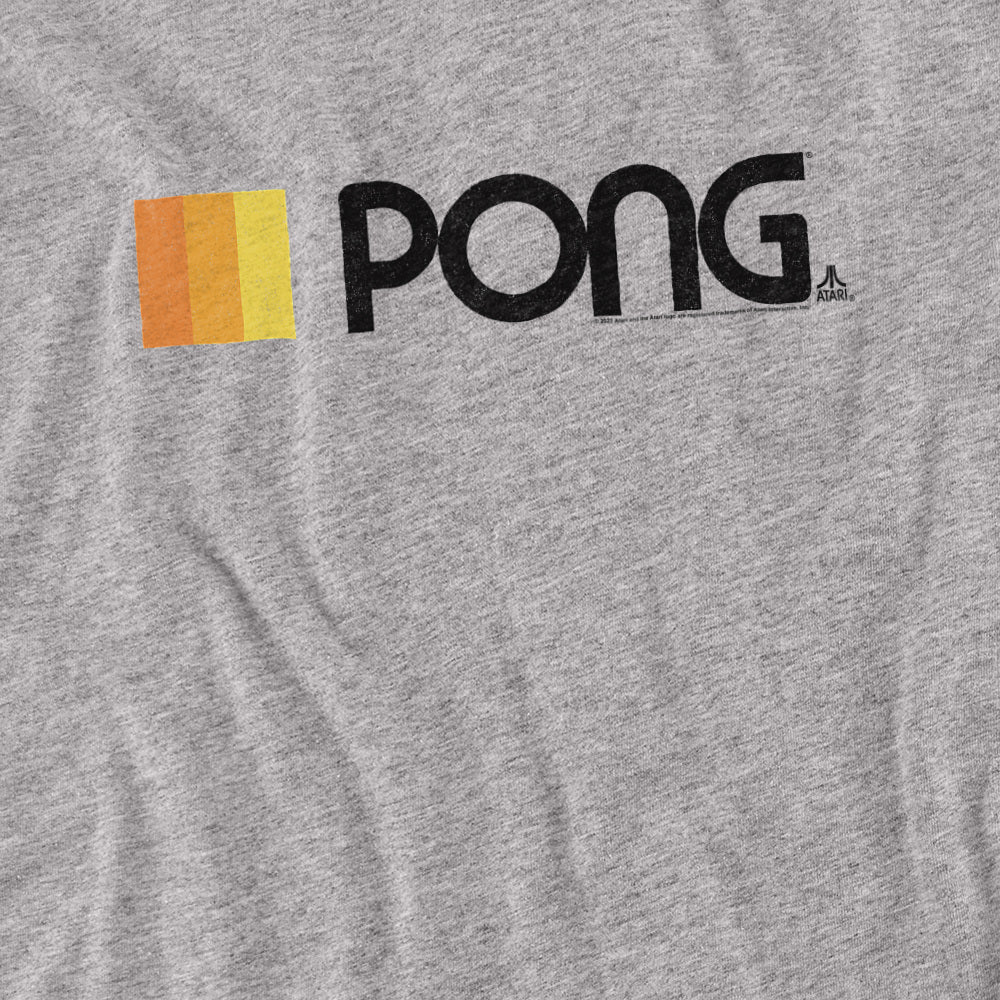 Heather gray t-shirt featuring a retro Pong design with bold black text "PONG" and three vertical gradient bars in orange and yellow to the left.
