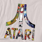 A light gray t-shirt featuring the Atari logo and text filled with colorful artwork from classic Atari games, including rockets, space battles, and vibrant arcade-inspired graphics.
