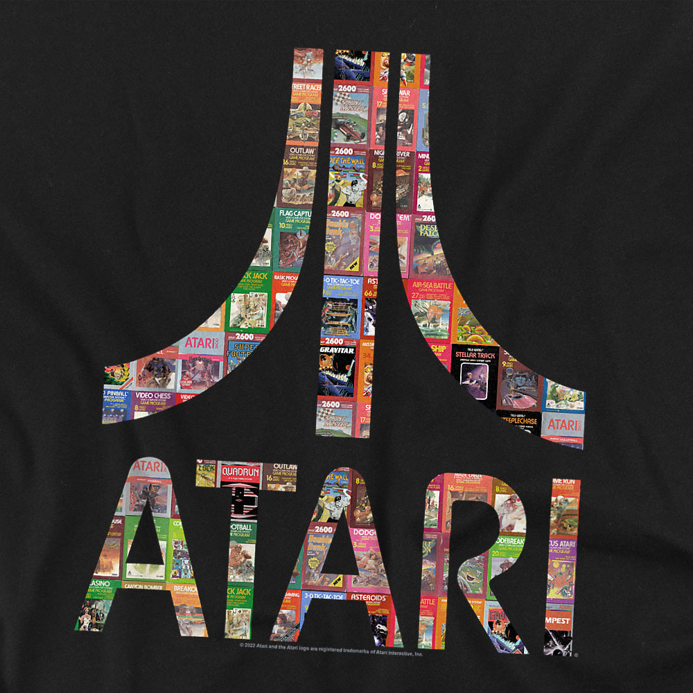 A black t-shirt with the Atari logo and text filled in with a collage of classic Atari 2600 video game covers, including titles like Asteroids, Centipede, and Missile Command.