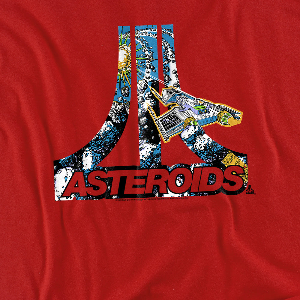 Step into the golden age of gaming with this officially licensed Atari Asteroids t-shirt. Printed on a striking red tee, the design showcases the legendary Atari logo filled with vibrant asteroid artwork and a starship zipping through the cosmic chaos. Below, the bold “Asteroids” title reminds you of one of the most addictive quarter-munchers of all time. Whether you spent hours dodging space rocks at the arcade or mastered the console port at home, this shirt is your ticket back to late nights, high scores, and the unmistakable thrill of the arcade era. Perfect for retro gamers, collectors, and anyone who loves classic 80s video games.