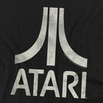 Black Atari t-shirt featuring the large white Atari “Fuji” logo with the word “ATARI” printed underneath in bold distressed letters, giving it a vintage worn-in look.