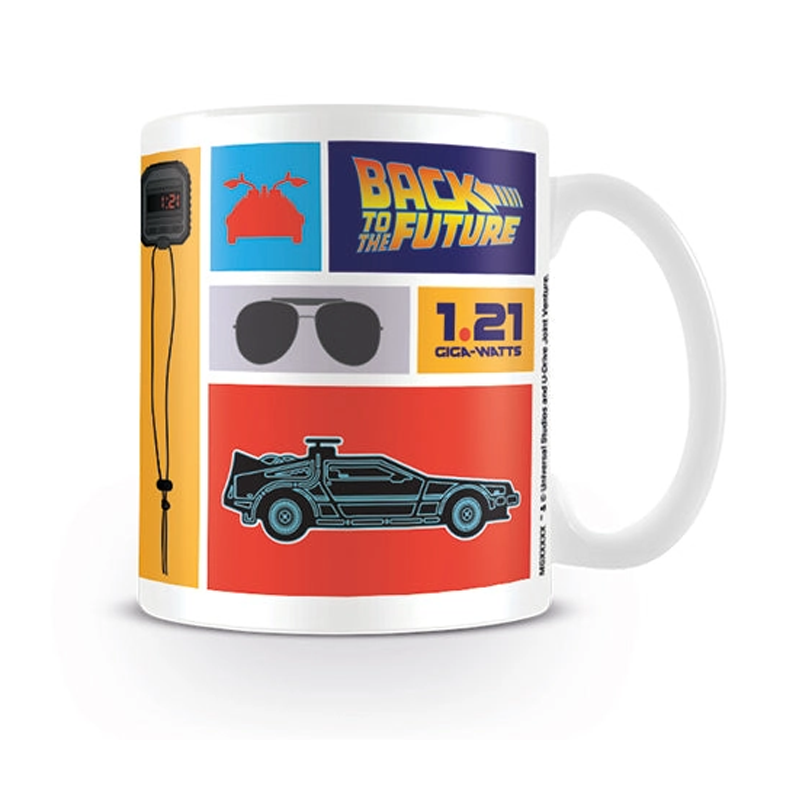 Officially licensed Back to the Future coffee mug featuring a collection of iconic items from the movie