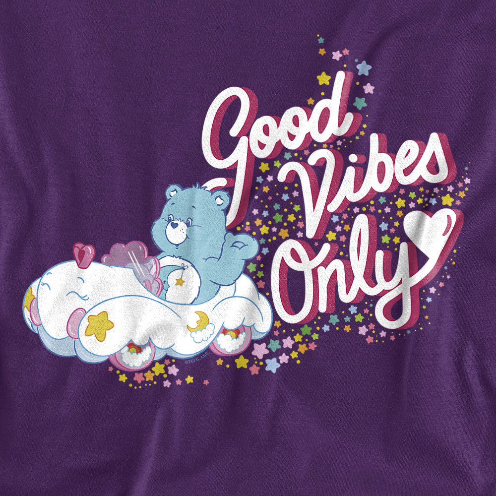 Purple Care Bears t-shirt with Grumpy Bear on a cloud and the words “Good Vibes Only” in pink script.
