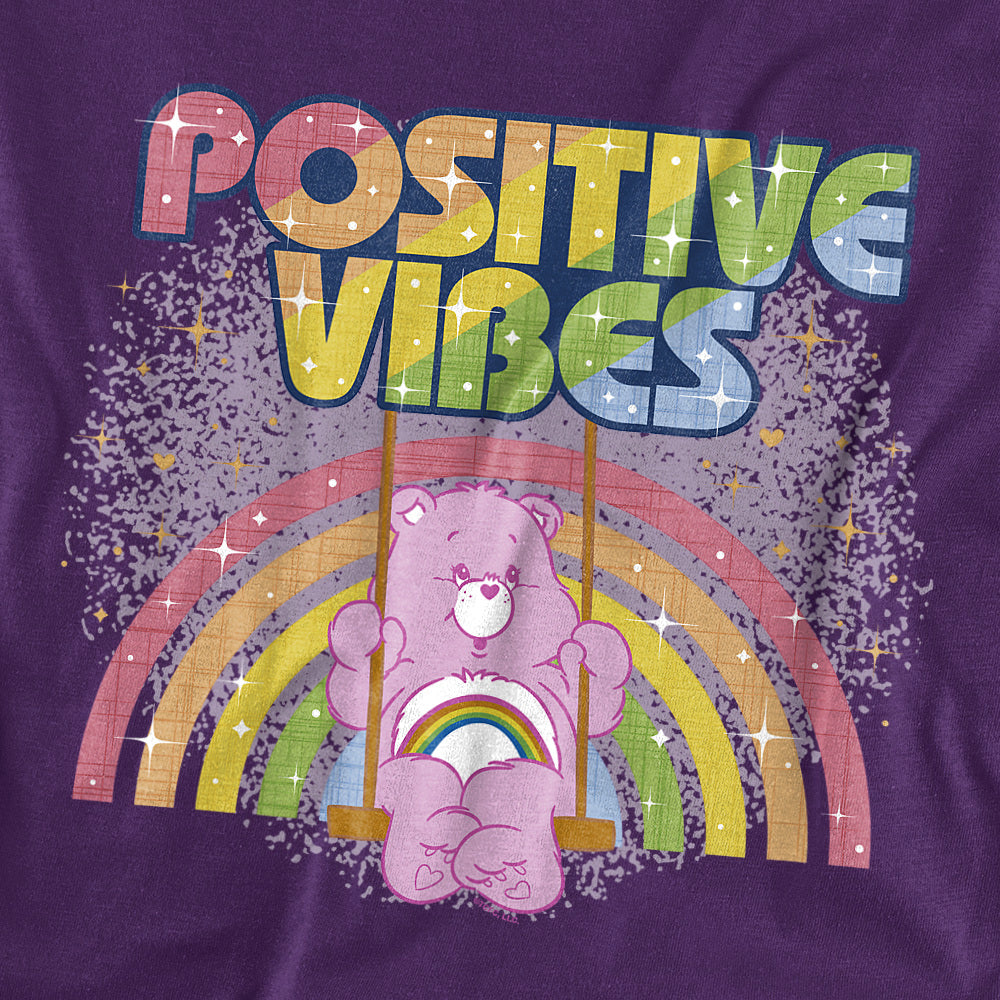Purple Care Bears t-shirt with Cheer Bear swinging in front of a rainbow and the words “Positive Vibes.”