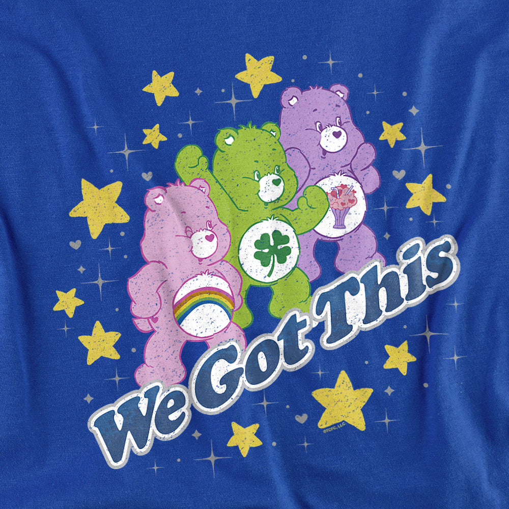 Blue Care Bears t-shirt with Cheer Bear, Good Luck Bear, and Share Bear surrounded by stars and the phrase “We Got This.”