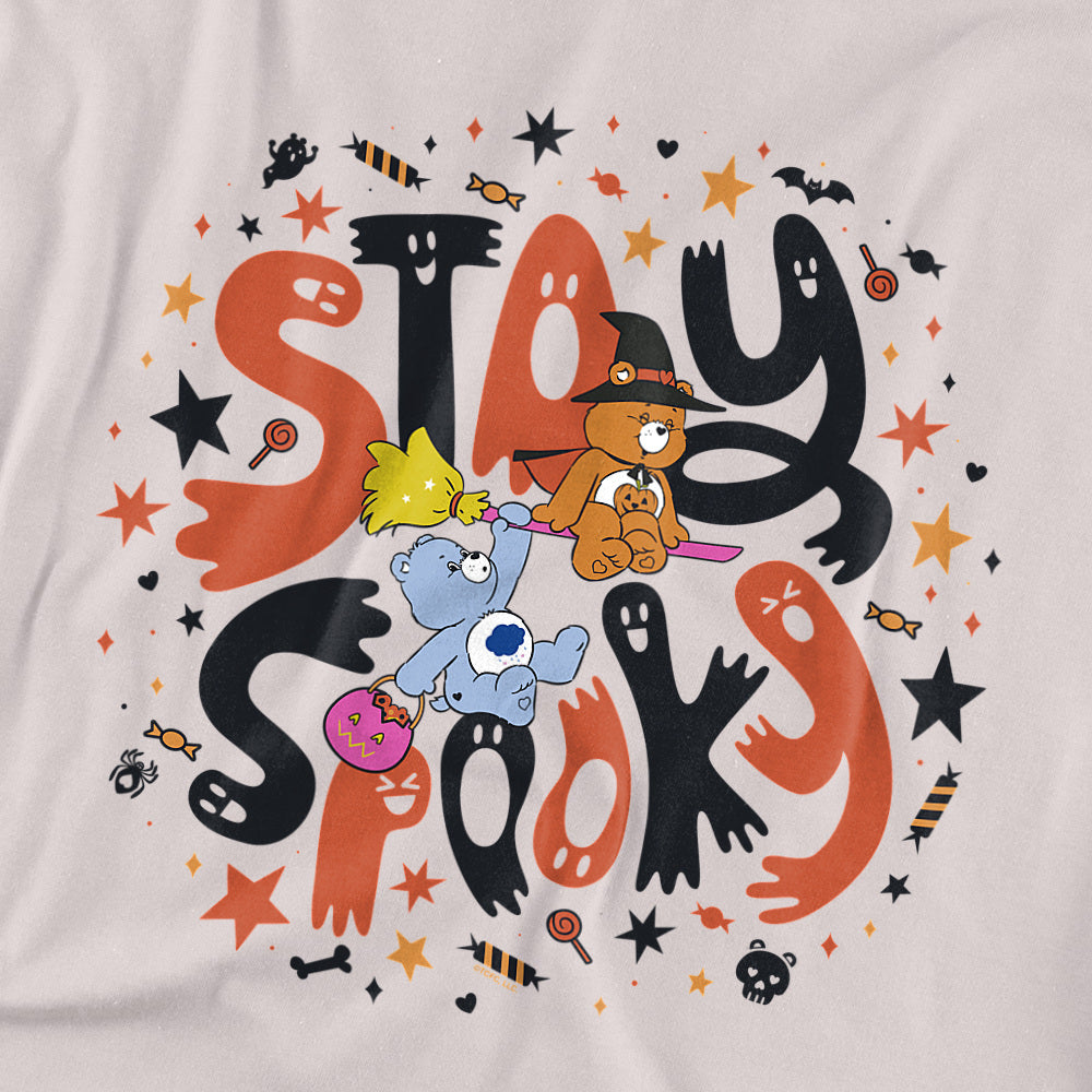 Light gray t-shirt with colorful Halloween design featuring Tenderheart Bear in a witch hat on a broom, Grumpy Bear holding candy, and Funshine Bear, surrounded by stars, bats, candy, and ghosts with bold lettering that reads “Stay Spooky.”