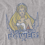A gray t-shirt featuring She-Ra from She-Ra: Princess of Power. She is illustrated with long blonde hair, a white costume, and a golden tiara. Below her, bold distressed blue text reads “I HAVE THE POWER!” with lightning bolt graphics surrounding the design.