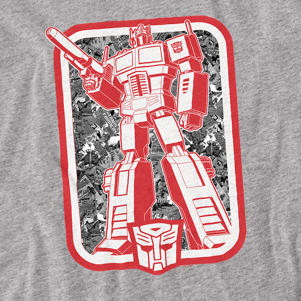 Gray t-shirt featuring Optimus Prime with a red Autobot logo below, styled in retro Transformers cartoon artwork.