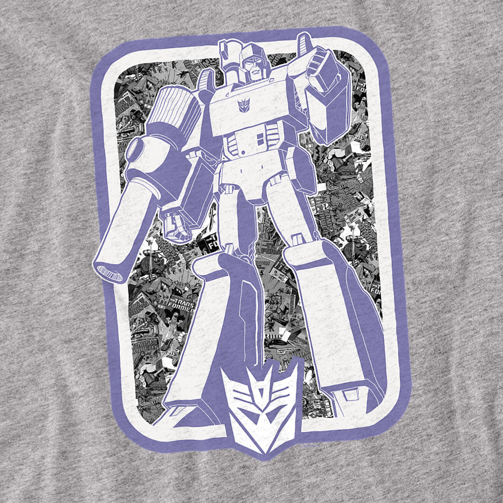 Gray t-shirt featuring a large graphic of Megatron with the purple Decepticon logo beneath him, styled in retro Transformers cartoon artwork.